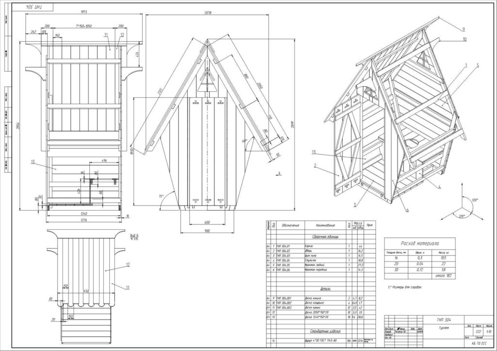 Туалет собирают согласно чертежу туалета теремок. Согласно схеме туалета теремок сначала из брусьев собирают каркас всего туалета. Потом делают пол из досок и обшивают боковые и заднюю стенки.