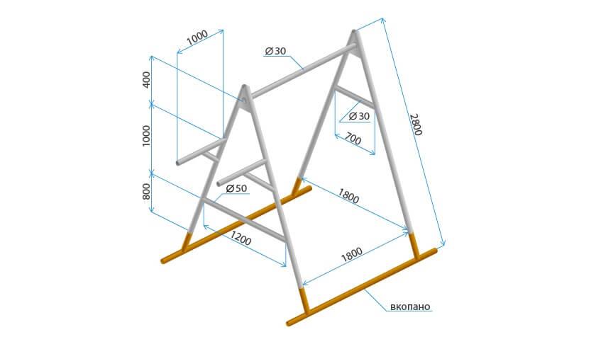 Здесь конструкция сварена из профильной трубы диаметром 30 мм, на соединении А-образных опор добавлены косынки, брусья снабжены подкосами.