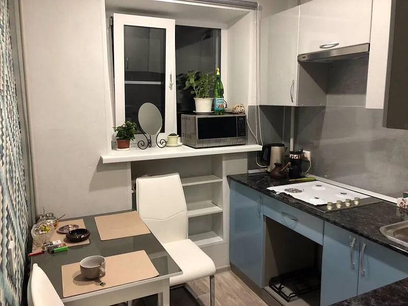 При отсутствии балкона или лоджии подоконник можно полностью переоборудовать, превратить его в рабочую поверхность с мойкой в углу, шкафчиками или полками под столешницей или обеденный стол.
