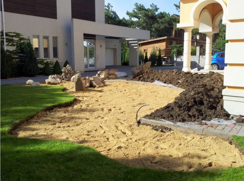 - Формирование насыпи. Грунт нужно насыпать горкой, придав ей желаемую форму. Утрамбовать его нужно очень хорошо: учтите, чито ему придется выдерживать вес камней.