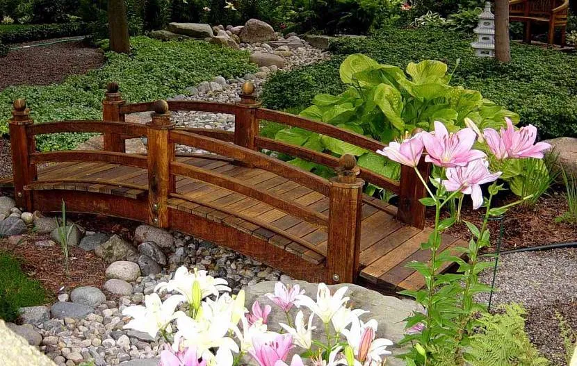 - Мостик можно сделать из металлического каркаса с закрепленными досками. Но его проще купить под заказ.