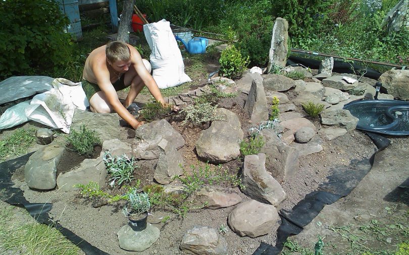 Для создания «ленивых альп» понадобится песок, щебень, гравий и специальный текстиль. Первым делом грунт перекапывается и перебирается от сорных растений. Затем засыпается песком слоем до 10 см. Сверху стелется геотекстиль, а за ним укладывается гравий.