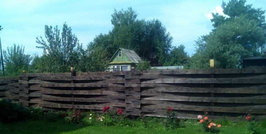 Далее — два фото плетеных заборов из досок.Видна разница в использовании более узких и более широких досок. В первом случае это 100 мм, во втором — 150 мм.