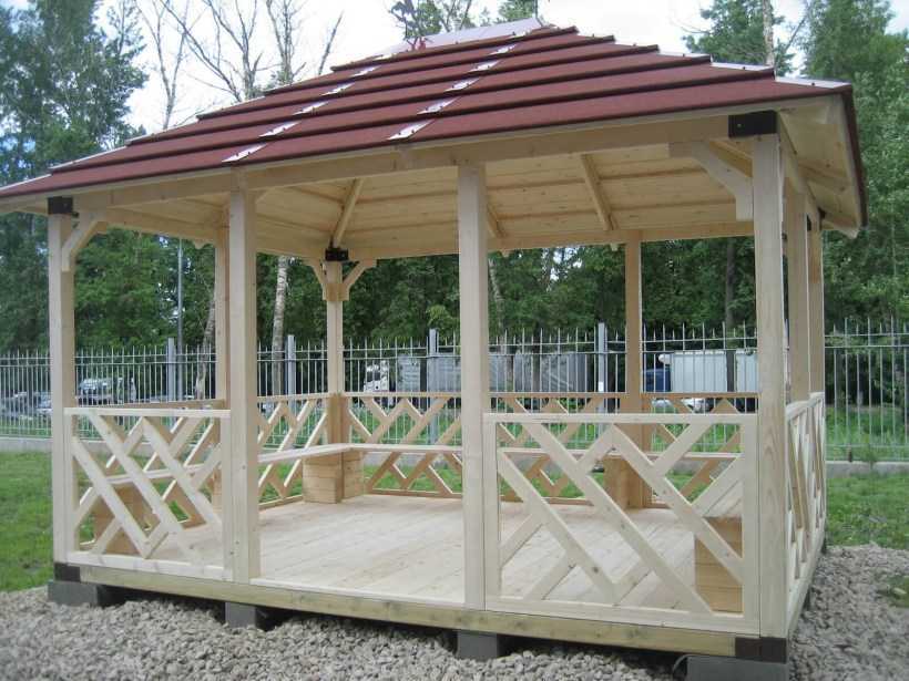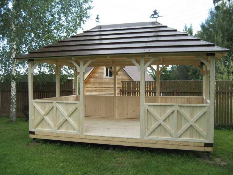Считается классической квадратной беседкой. Просторная. Крыша делается двух- или четырехскатной.