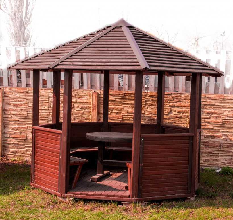 Даже в деревянной беседке подходящего размера можно установить мангал, барбекю или печь