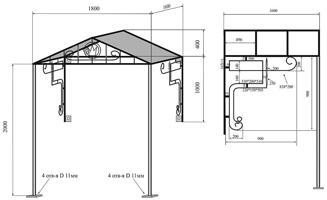 Любая конструкторская работа начинается с составления эскиза и чертежа. Козырек не является исключением, так что, если беретесь за дело сами, не поленитесь начертить хотя бы вариант «на коленке», точно определив размеры всех частей конструкции. Это сильно поможет вам по ходу дела. В идеале нужно рассчитать и нагрузки с поправками на налипший снег, ветер и прочие факторы, но мы обычно поступаем проще – делаем все с запасом, от широты русской души.