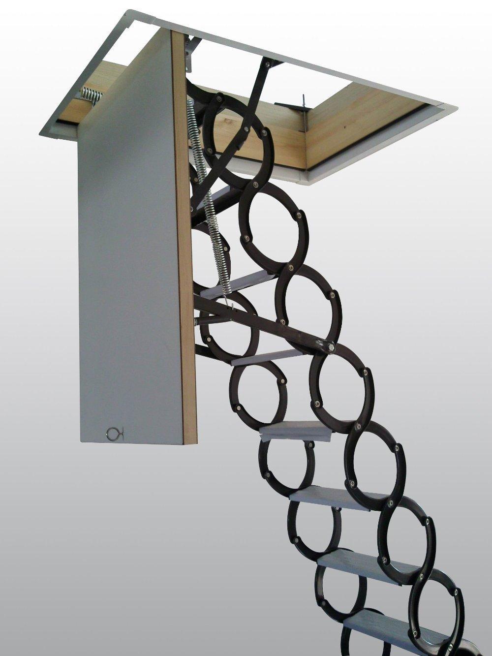Данный вид чердачных лестниц изготавливается из металла. Принцип их конструкции относительно несложен – секции ступенек соединяются клином по принципу ножниц (как показано на фото). В сложенном состоянии система напоминает пружину. Также ее можно оснастить специальным приводом, управлять которым можно с помощью пульта.