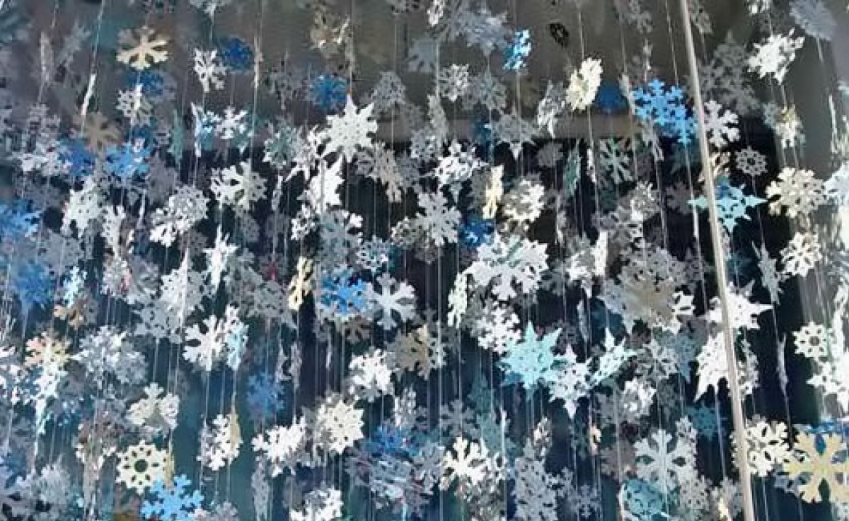 Также можно заполнить любое свободное офисное пространство подвесными нитями со снежинками, создавая из них определенную снежную композицию. В этом снежном пространстве также можно эффектно разместить офисный логотип или аббревиатуру, а также некоторую рекламу компании.