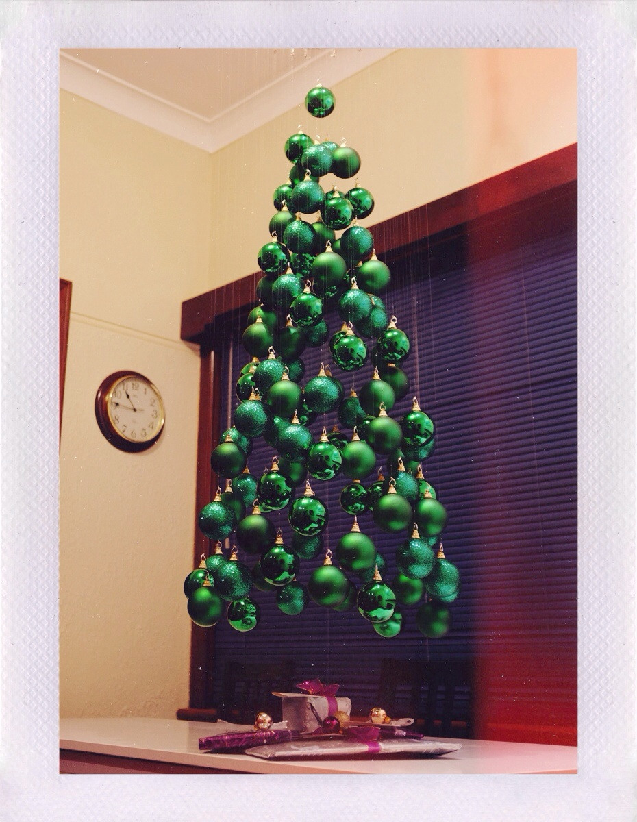 Такой вариант будет особенно кстати, если творческой мысли в пространстве негде «разгуляться» по причине его нехватки в вашем офисе. Один из углов можно украсить стильной, перевернутой вниз, елкой с новогодними игрушками и гирляндами, очень креативное и самодостаточное решение.