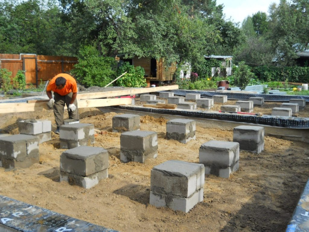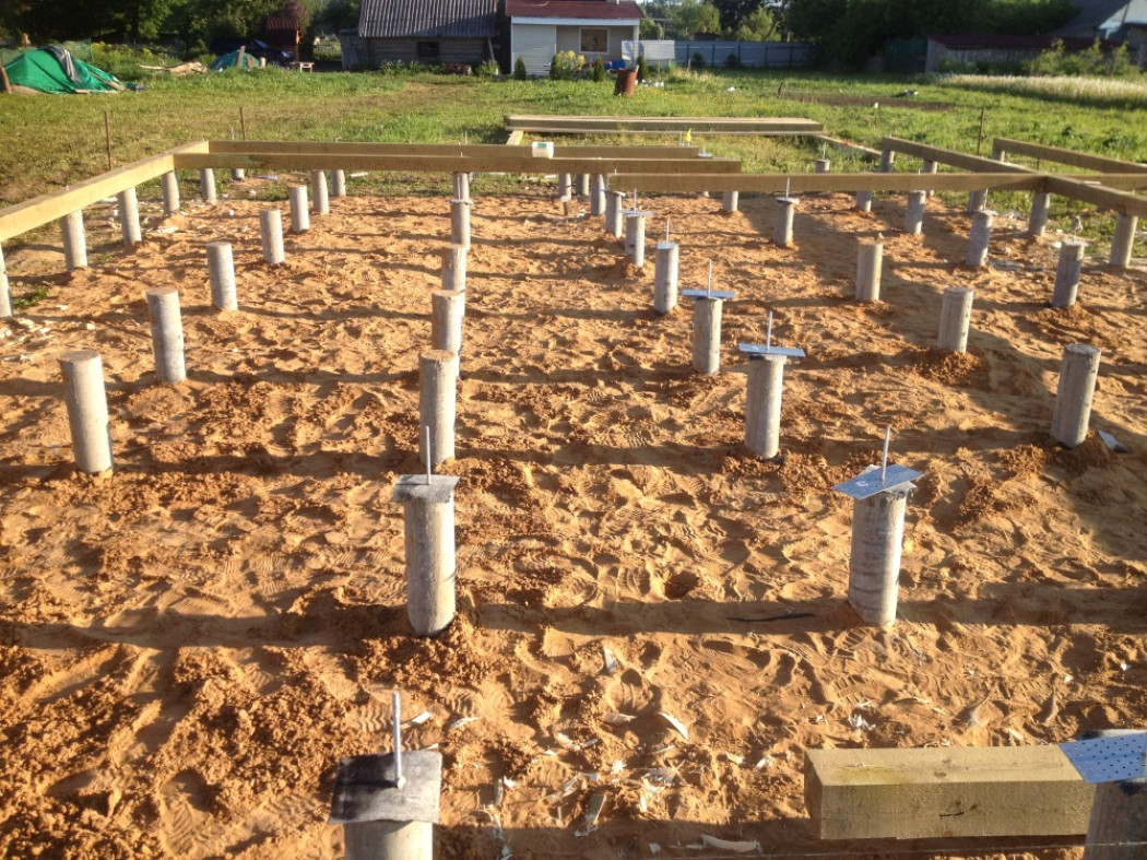 Основные элементы такого фундамента – отдельно поставленные столбики. Прочность основания во многом зависит от их правильной установки. Строительство на пылеватом и мелком грунте требует большого заглубления основных элементов фундамента. При несоблюдении этого условия не исключено расхождение столбиков или перекос, что грозит образованием трещин в стенах постройки. Кроме того, при морозном пучении грунта может наблюдаться выталкивание столбиков основания, а при оттаивании – их опускание. В результате строение деформируется и разрушается.