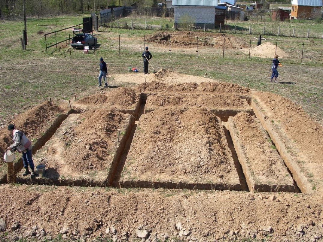 Для обустройства фундамента необходимо сделать углубление, которое зависит от выбранного типа основания. Для закладки монолитной плиты нужно вырыть котлован, для ленточного основания роют траншею, под столбчатый фундамент готовят круглые или квадратные ямки. Перед началом работ обязательно организовывают отвод поверхностной воды, которая способствует разжижения почвы и снижению ее несущих характеристик. Для решения проблемы достаточно сделать канавки.