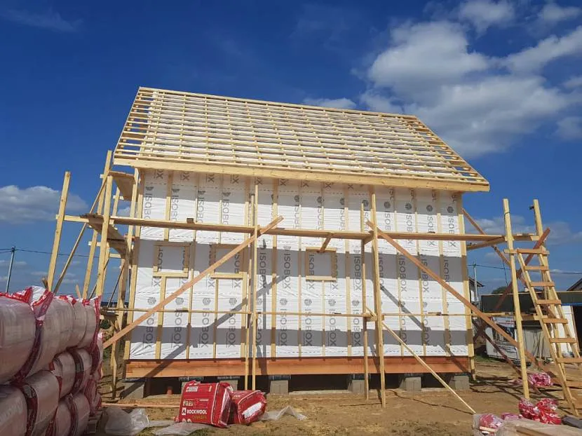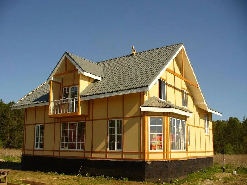 Не следует забывать об антисептиках, а также об антипиренах для обработки древесины. Крышу обычно делают из гибкой финской черепицы. Очень привлекательно смотрится отделка каркасного жилища, имитирующая деревянный брус. Для теплоизоляции используют пенопласт или минеральную вату. Утеплитель с наружной стороны стен защищают влагостойкой фанерой, цементно-стружечными плитами.