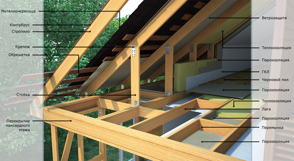 Обрешетка кровельного перекрытия не должна провисать, поэтому расстояние между балками перекрытия соблюдается в пределах 60 см. балки перекрытия соединяются со стропильной системой железными шпильками-скобами. Для перекрытия 1-го этажа рекомендуется установить деревянные подпорки из бруса, перекрытие 2-го этажа может обустраиваться без дополнительного укрепления.