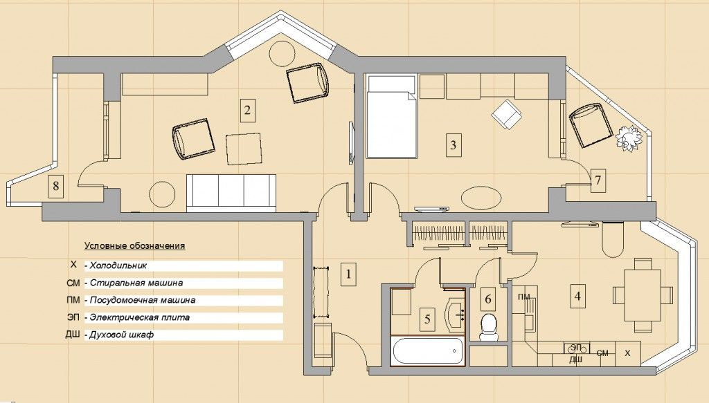 Если говорить о трехкомнатной квартире, то в них не очень часть практикуется снос стен. Если такое и происходит, то обычно в двух случаях – слияние гостиной и кухни или объединение санузла.