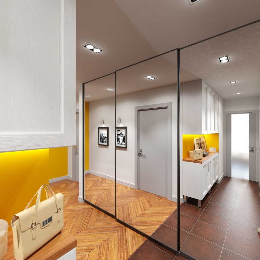 Пространство нужно поделить на вход и коридор-холл. У двери нужна вешалка или встроенный шкаф-купе, большое зеркало.