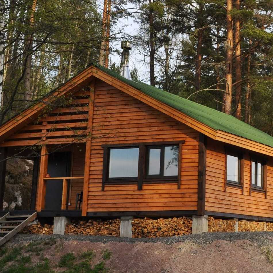 Если одноэтажный дом 6х8 – это главное жилое здание, можно сделать мансарду с ломаной или двускатной крышей для увеличения пространства. Возвести ее лучше из клееного бруса. Это более затратный вариант в сравнении со стандартным деревом, зато он долговечен и прочен. Строительство из такого материала можно начать почти в любое время года, так как они дают меньшую усадку, чем оцилиндрованные бревна.