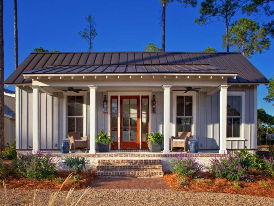 Проект площадью до 100 м2. Для семьи из трех-четырех человек комфортным считается жилье с минимальной площадью 50-70 м2. Такие постройки в плане нередко имеют Г-образную форму. Продуманное проектирование позволяет удобно разместить основные помещения: гостиную, столовую (их часто совмещают), кухню, прихожую, одну ванную комнату и личные (спальные) комнаты. Дом в 50 м2 может вместить гостиную, скромную кухню и ванную, пару спальных комнат. Проект нередко предусматривает небольшую веранду или крыльцо; для визуального расширения помещений применяется панорамное остекление.