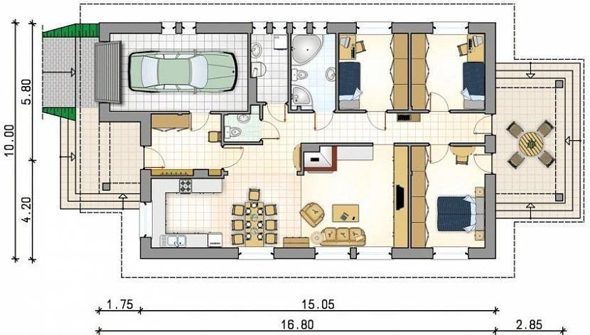 Проект с тремя спальнями и гаражомИсточник idei-dekoru.com