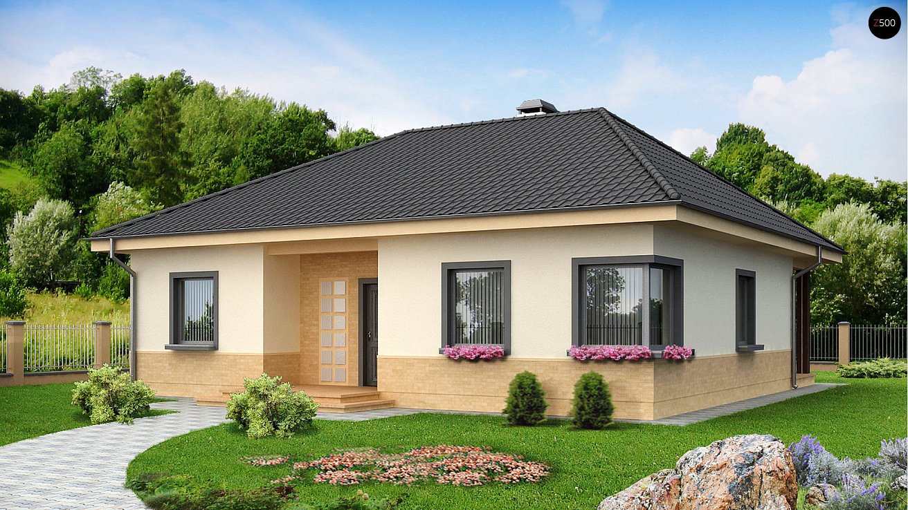 Это самое простое строение, имеющее одноуровневое размещение всех помещений, суммарная площадь которых составляет 54 кв. м. Такой дом довольно экономичен в плане обустройства его отоплением, системой канализации и прочими коммуникациями.