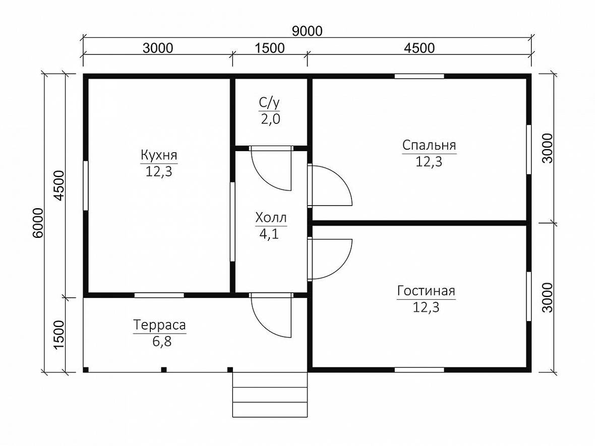 Обычно дом в один этаж позволяет разместить гостиную, кухню, одну или две спальни, санузел и прихожую-тамбур.