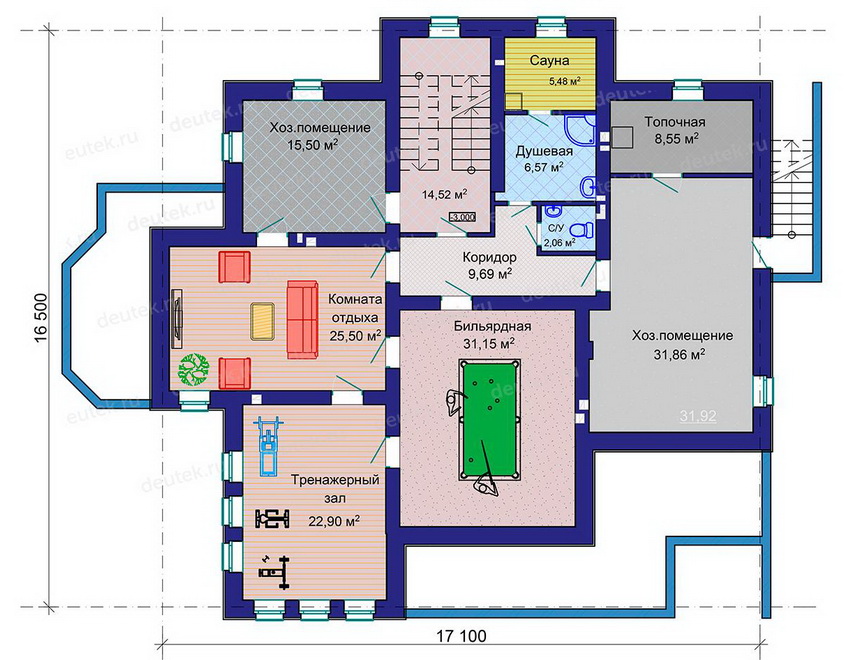 - в цокольном этаже могут быть расположены помещения, не вписывающиеся в общий стиль дома: организовать можно мастерскую, бойлерную, игровую комнату, спортивный зал;