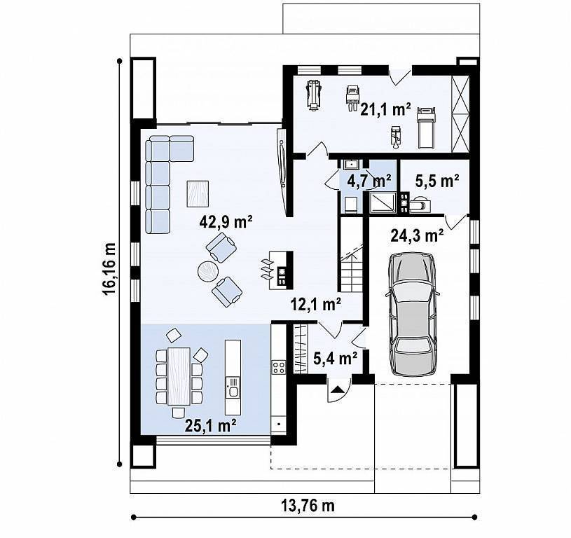 Кухня слева примыкает к санузлу и отделена от него перегородкой. Гостиная находится прямо за холлом. С кухней её разделяет перегородка. Такой дом рассчитан на проживание семьи из 4-5 человек.