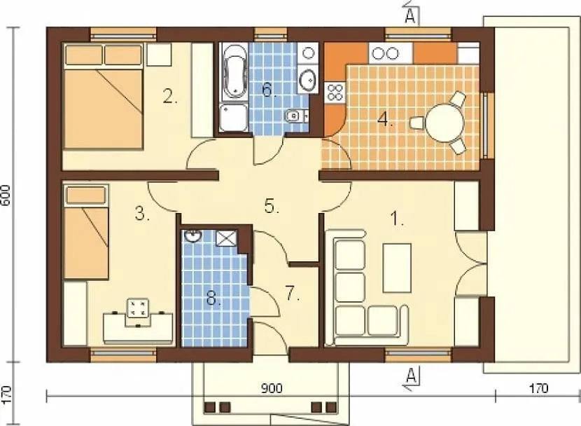 Крыльцо дома составляет 3,90 кв.м, тамбур 2,36 кв. м, две спальни 7,70 кв. м каждая , холл 5,27 кв. м, кухня-гостиная 15, 82 кв. м, с/у 2, 36 квадратных метра. Такая планировка очень удобна для семейного проживания, поскольку все отлично продумано.