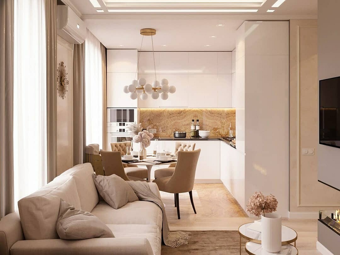 Дизайн в классическом стиле отличается меблировкой из натуральных материалов и деревянным кухонным гарнитуром, за фасадами которого скрывается вся современная техника. Комната оформляется в пастельных тонах и украшается лепниной, позолоченными, бронзовыми элементами и другими роскошными деталями.