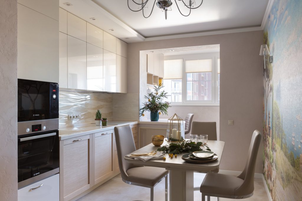 Если помещения совмещены, на кухне появляется пространство для установки более габаритной мебели. Тот же диван уже можно выбирать без оглядки на сковывающие условия. Однако нельзя забывать, что демонтаж окон и дверей, а также утепление балкона повлекут за собой дополнительные траты и необходимость получить разрешение у соответствующих инстанций.