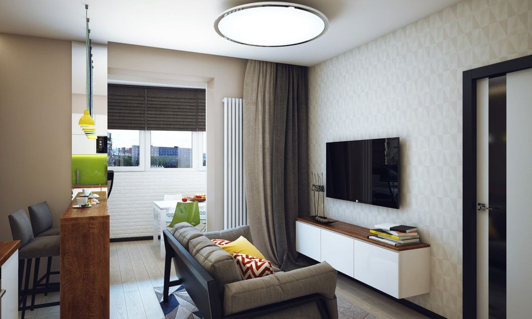Планирование пространства на столь ограниченной площади подчиняется простым законам лаконичности, функциональности, эргономичности. В такой комнате присутствует как минимум две зоны — кухня и непосредственно гостиная, но может быть включена столовая. Хотя для нее остается совсем мало места, поэтому вместо обеденной группы часто используют барную стойку, полуостров — это лаконичная альтернатива столовой, которая одновременно служит инструментом зонирования.