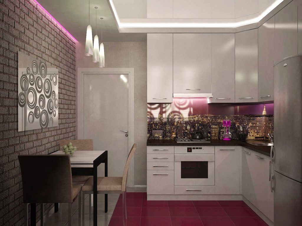 Глянец отражает свет. Не секрет, что светлое помещение визуально кажется более просторным, потому есть смысл в оформлении использовать оттенки посветлее. Впрочем, при 9 квадратах такая оптическая иллюзия не будет работать на полную, если вы не усилите ее при помощи блестящих глянцевых поверхностей. В условиях кухни сделать это будет несложно, ведь блестеть может и натяжной потолок, и глазурованная плитка фартука, и отполированная поверхность гарнитура.