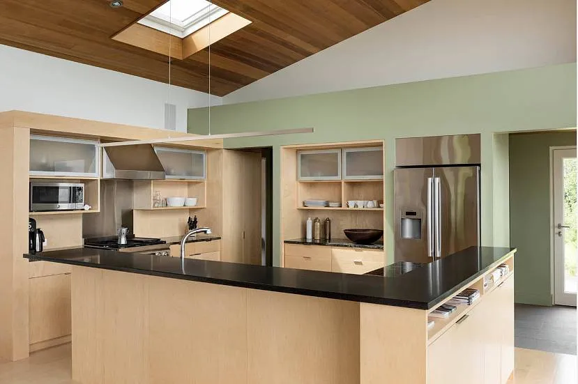 Другие стены покрываются краской, обоями, декоративными панелями. Мощная вытяжка используется при совмещении кухни и гостиной. Рабочая зона покрывается гладким материалом, кафелем, наливной смесью. Пол удобно очищается от грязи. Ковровая дорожка стелется, чтобы ноги не мерзли. Ламинат или паркет используется для зоны отдыха