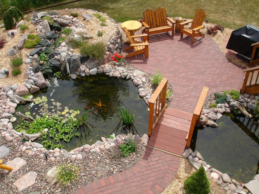 Следующая излюбленная идея для ландшафтного дизайна участка 10 соток — искусственный водоем. Его размещают во влажной зоне, чтобы не делать дренажную систему. Или украшают им площадку перед террасой — вид на воду во время отдыха успокаивает. Водоем может быть выполнен в виде пруда со стоячей водой, водопада или фонтана, ручья.