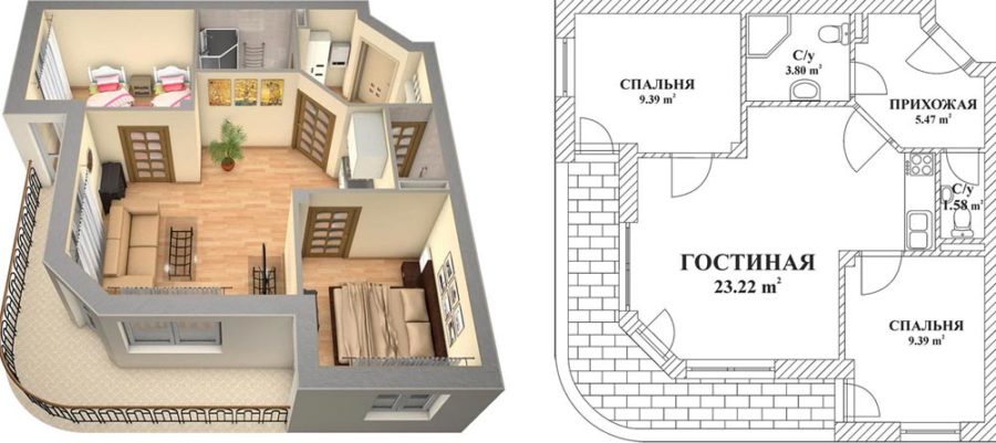 - хотя бы часть мебели должна располагаться перпендикулярно длинным стенам;