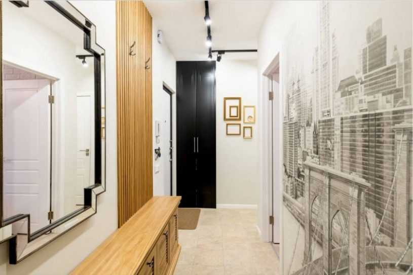В узком коридоре расположить габаритную мебель, особенно шкаф, почти невозможно, поскольку он «съест» практически всё свободное пространство и будет препятствовать комфортному перемещению в комнаты или на кухню. Лучше всего зонировать помещение, использовать комбинации различных отделочных материалов и многоуровневое освещение. Для отделки стен можно использовать фотообои с глубокой перспективой, что позволит визуально расширить пространство.
