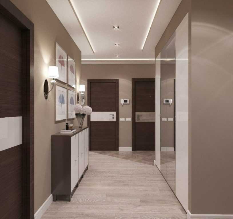 Правильно размещенные источники света в середине вытянутых стен также помогут создать торцевое затемнение. Фото оформления узкой входной зоны помогут выбрать выигрышный дизайн.
