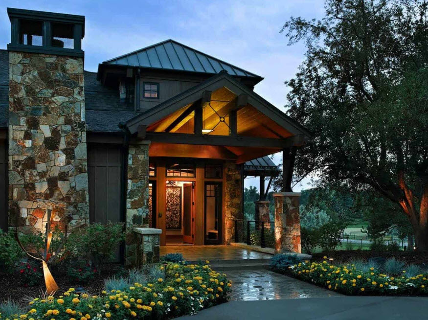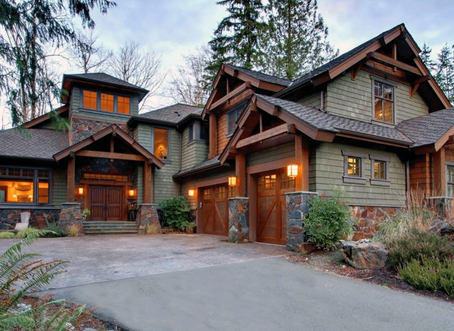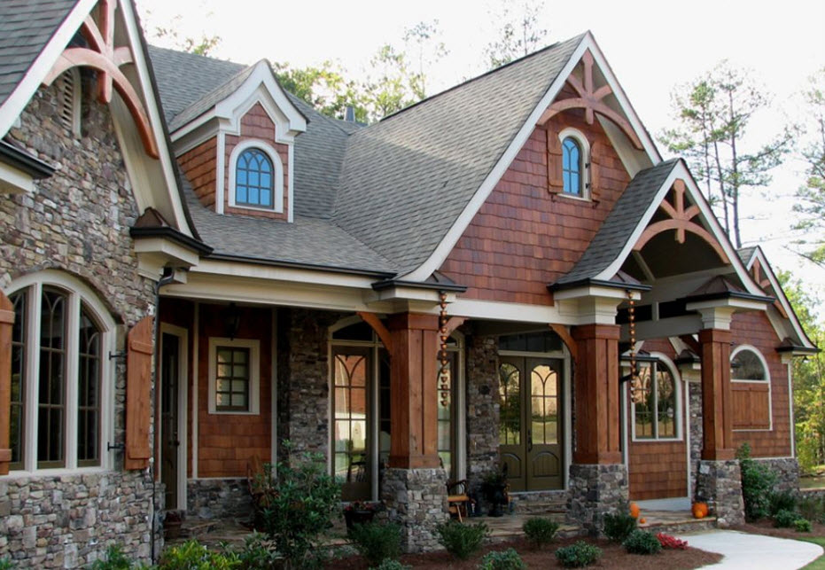 - для облицовки фасада используют натуральные материалы: первый этаж облицовывают камнем, второй — деревом, крышу выполняют из натуральной черепицы или дранки;