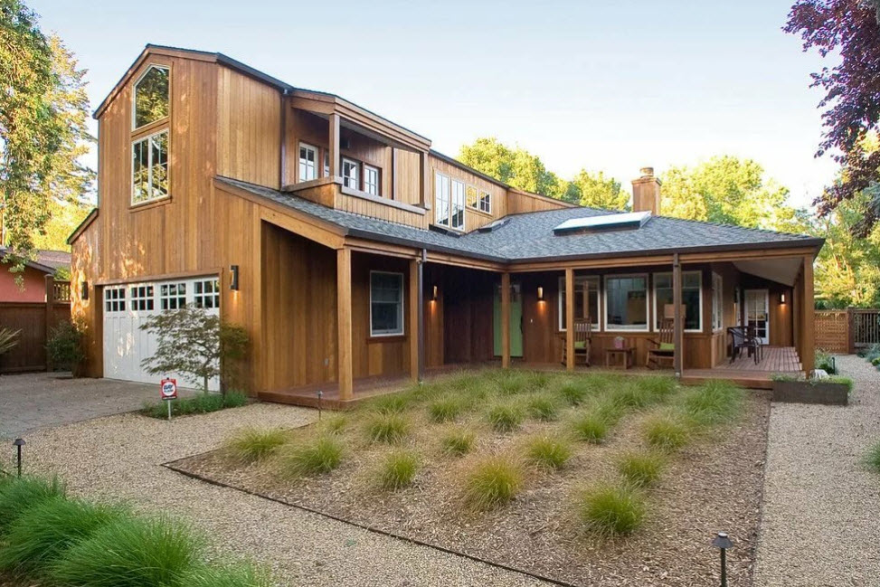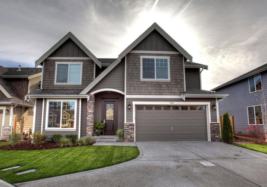- Экстерьер. Лаконичный, с преобладанием прямых линий, выполненный в светлых, спокойных тонах. В отделке используют натуральные материалы (камень, кирпич, древесина) или покрывают фасадные стены штукатуркой, вагонкой, виниловым сайдингом.