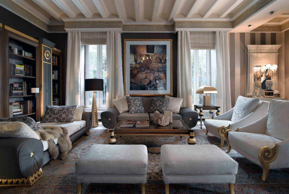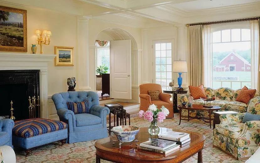Мебель, особенно в гостиной, расставляют по центру, вокруг камина, телевизора, журнального столика. Это могут быть массивные удобные диваны и кресла. В зоне столовой — огромный добротный стол и стулья вокруг него. В таком помещении места хватает всем.