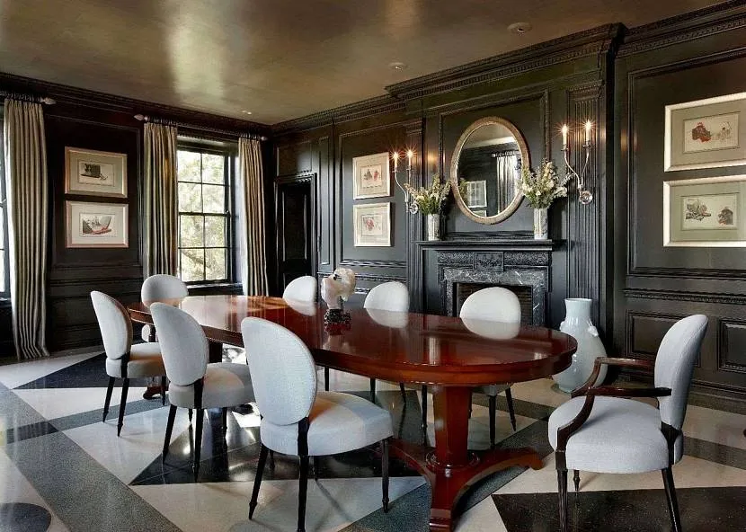 Чтобы выделить отдельные элементы дизайна, применяют насыщенную гамму. Шоколадный цвет придает оформлению рельефности и глубины. Он встречается на балках потолка, в рисунках на шторах или в резьбе на мебели. Американская классика в интерьере заиграет свежими нотами с черным или графитовым геометрическим орнаментом на светлом фоне.