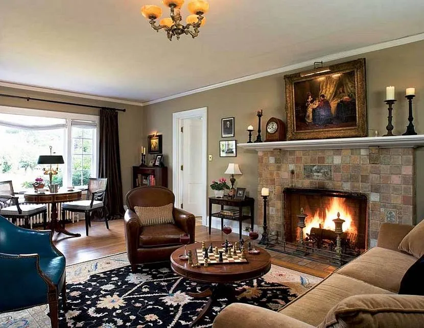 - Мебель – массивная, но не вычурная (деревянная или кожаная).