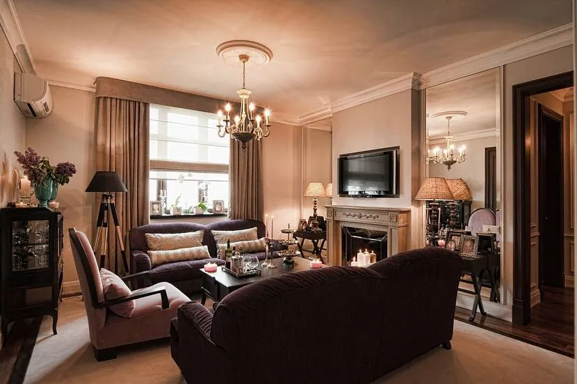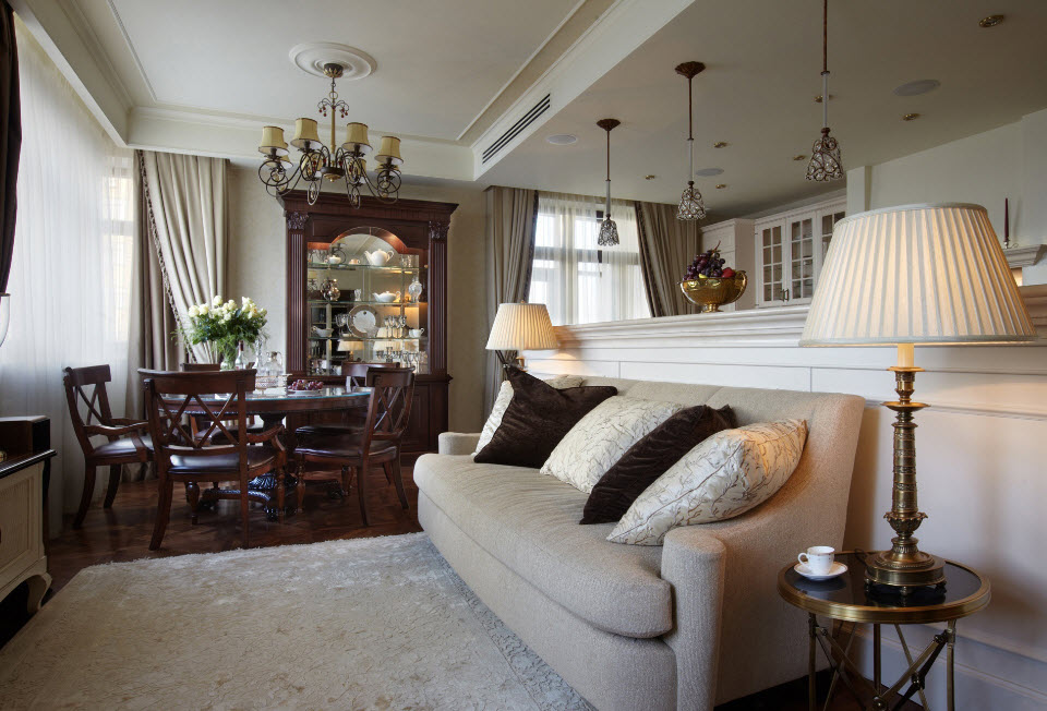 - Освещение. В центре больших помещений допускается использование торжественной люстры, дополненной торшерами и настольными лампами. Использование подсветки по периметру для создания функциональных зон также допустимо.