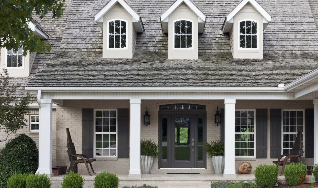 - Окна. Проекты американских домов характеризуются большим количеством окон. Часто они имеют арочную форму — влияние испанского стиля, и снабжены ставнями.