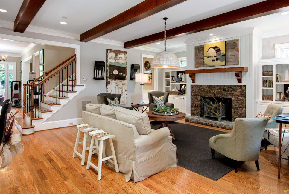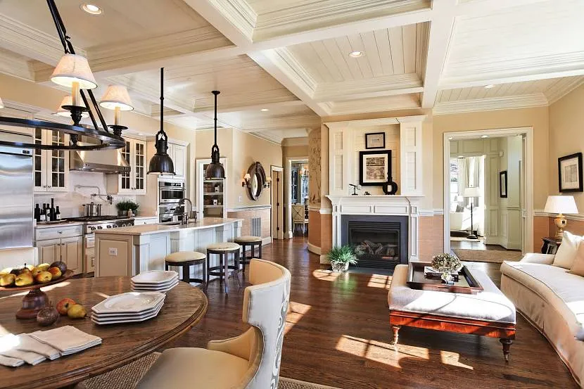 В дизайне интерьеров американских домов предпочтение отдается простоте и минимализму. Помещения первого этажа дома объединяют в общее пространство довольно больших размеров. В гостиной размещают камин и легкую, удобную мебель. Цветовую гамму выбирают спокойных оттенков: зеленого, серого, пастельных тонов. В оформлении помещений используют обилие текстиля – ковры, подушки, шторы способствуют созданию уютной обстановки. В декоре сочетают классические элементы дизайна и современные аксессуары.