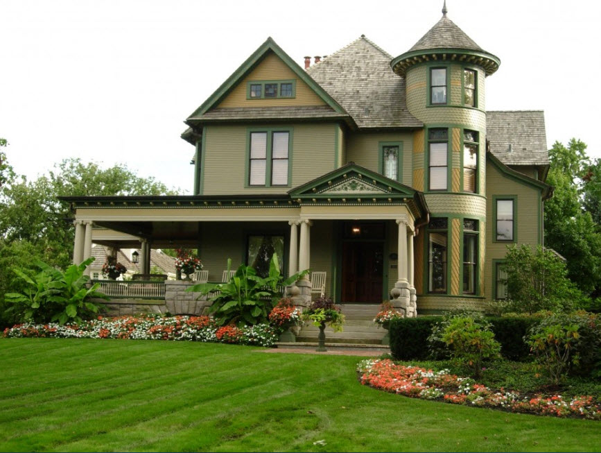 - Окружение. Приусадебный участок четко зонирован и ухожен; хозяева выделяют место для детской игровой площадки, зоны барбекю, садовой мебели, бассейна. Перед главным фасадом часто располагается ухоженная лужайка с гордостью хозяйки — цветочной клумбой.