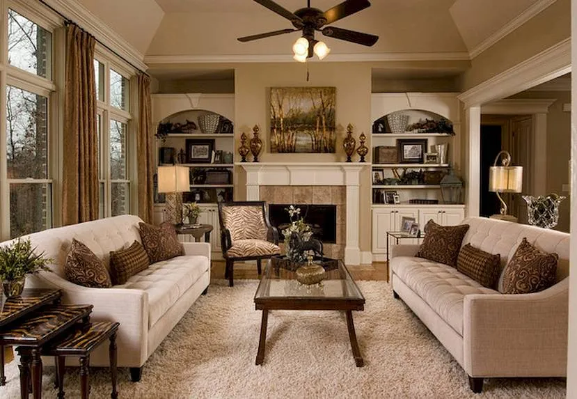 В американском интерьере вдоль стен располагают полки, негабаритные комоды. Если в помещении есть ниши, то свободное пространство приспосабливают под встроенные шкафы. Системы хранения психологически не давят на человека, не создают визуального уменьшения квадратных метров.
