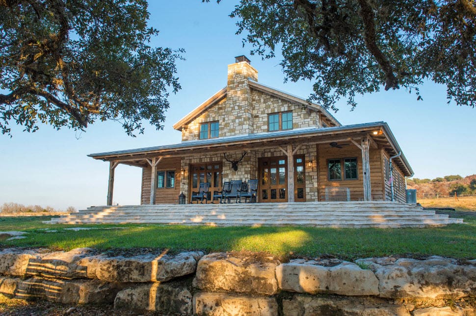 - Стили фасадов домов Кантри в американской версии склоняются, как правило, к имитации ранчо. Здесь не обойтись без использования деревянных колонн, причем они применяются ни столько в качестве декоративных элементов фасада, сколько служат в роли подпорок. Кроме того, для американского Кантри характерно наличие широких открытых террас.