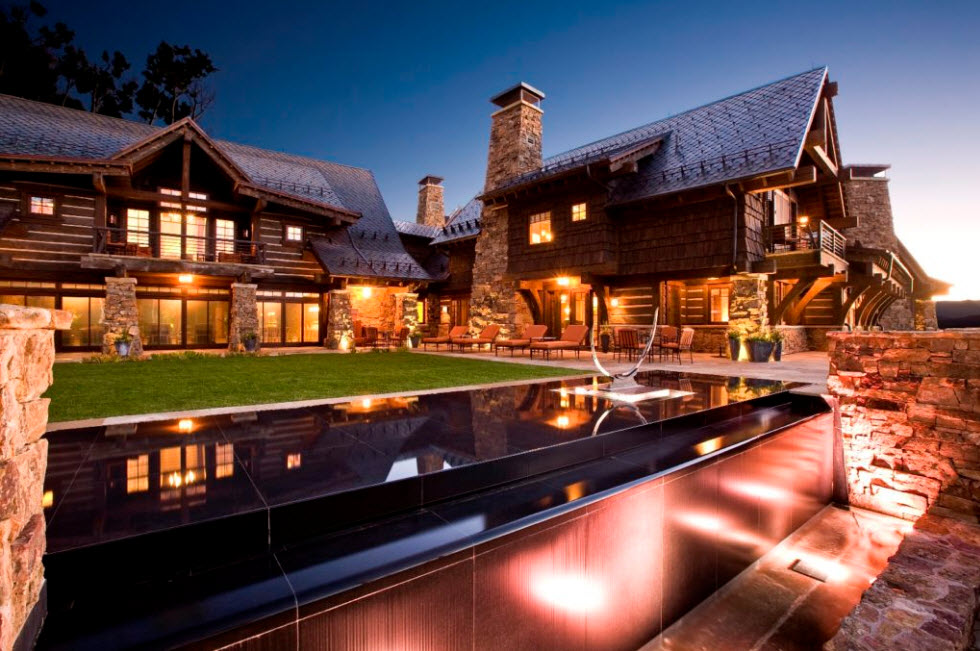 - двускатные пологие крыши, которые сильно выступают за пределы дома. В горах этот прием необходим для защиты прилегающей территории от снега. Под нависающей крышей располагаются уютные балконы, второй этаж — мансардный. Кроме того, для альпийского стиля характерно наличие больших террас без ограждений, которые выходят за периметр дома;