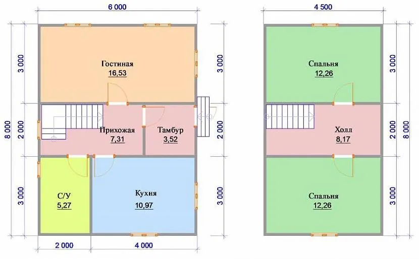 Особенности планировки и расположение помещений в двухэтажных домах 6х6