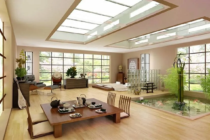 В центре комнаты устанавливают футон или низкий стол. Вокруг размещают небольшие шкафчики, напольные светильники, икебаны в больших вазах. Все предметы в помещении располагают таким образом, чтобы всем жильцам здесь было максимально комфортно.